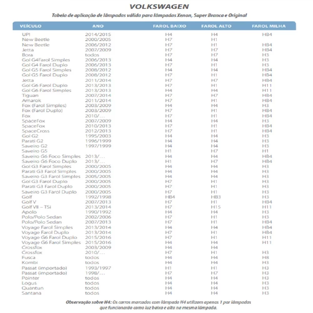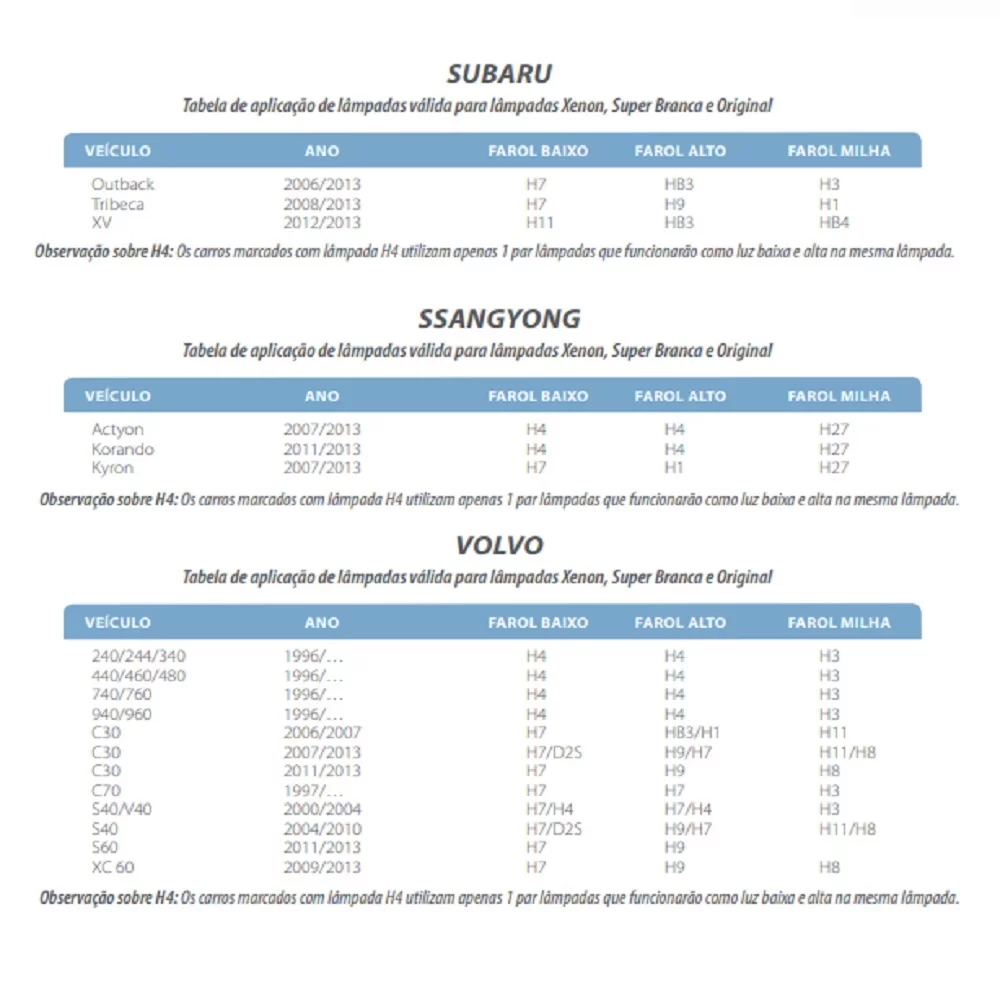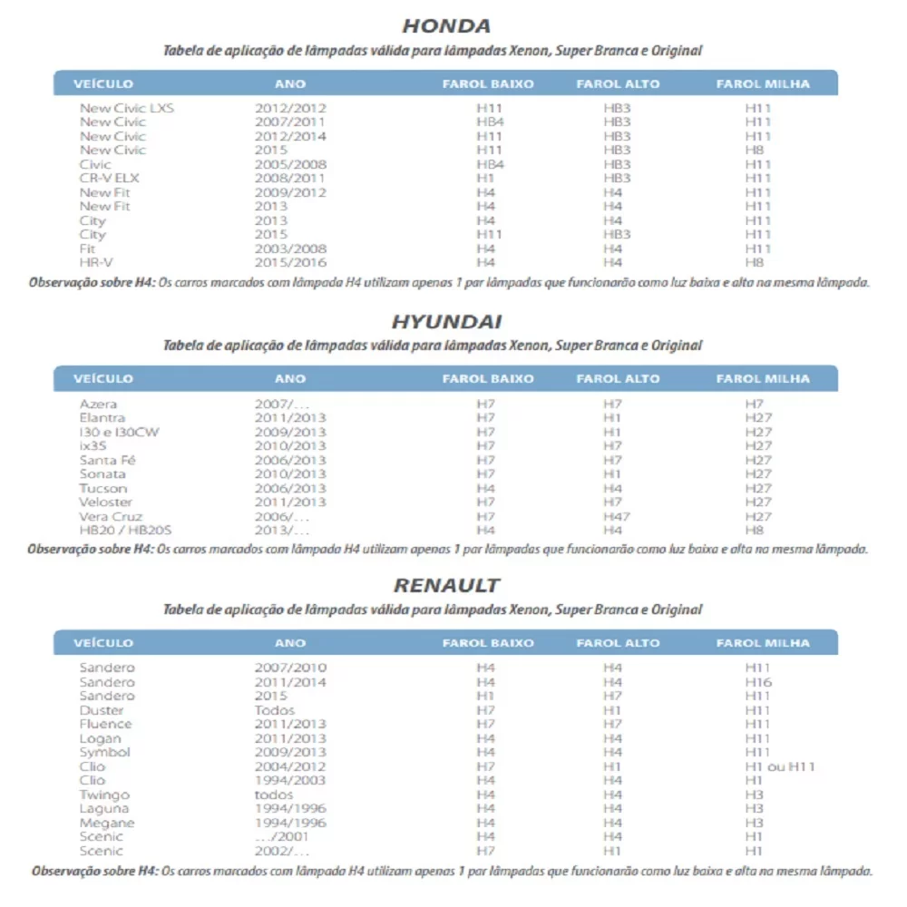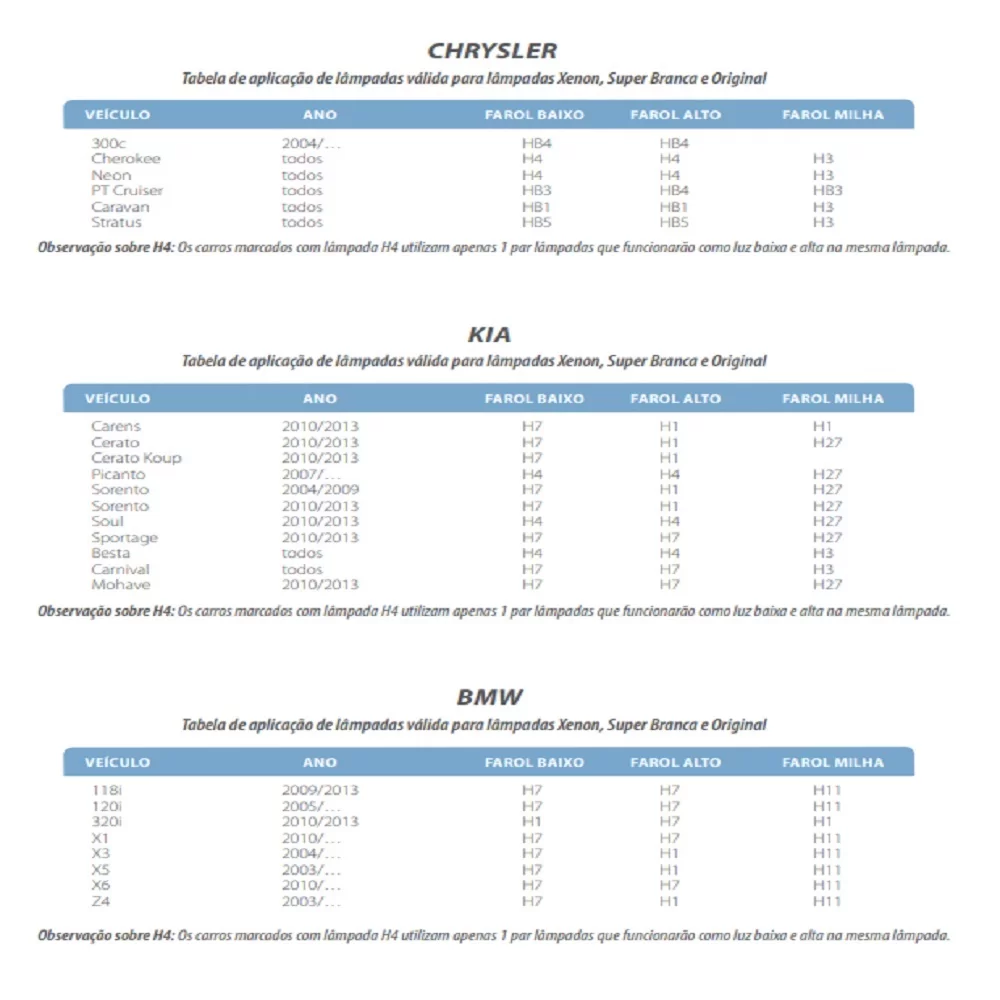 Aplicação para farol baixo nos seguintes carros: